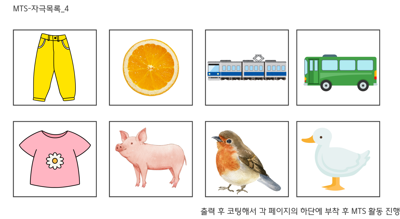 이번 자료는 처음 치료를 시작한 초기학습자 아동들에게 필요한 MTS(Matching To Sample)활동에 필요한 교안입니다.